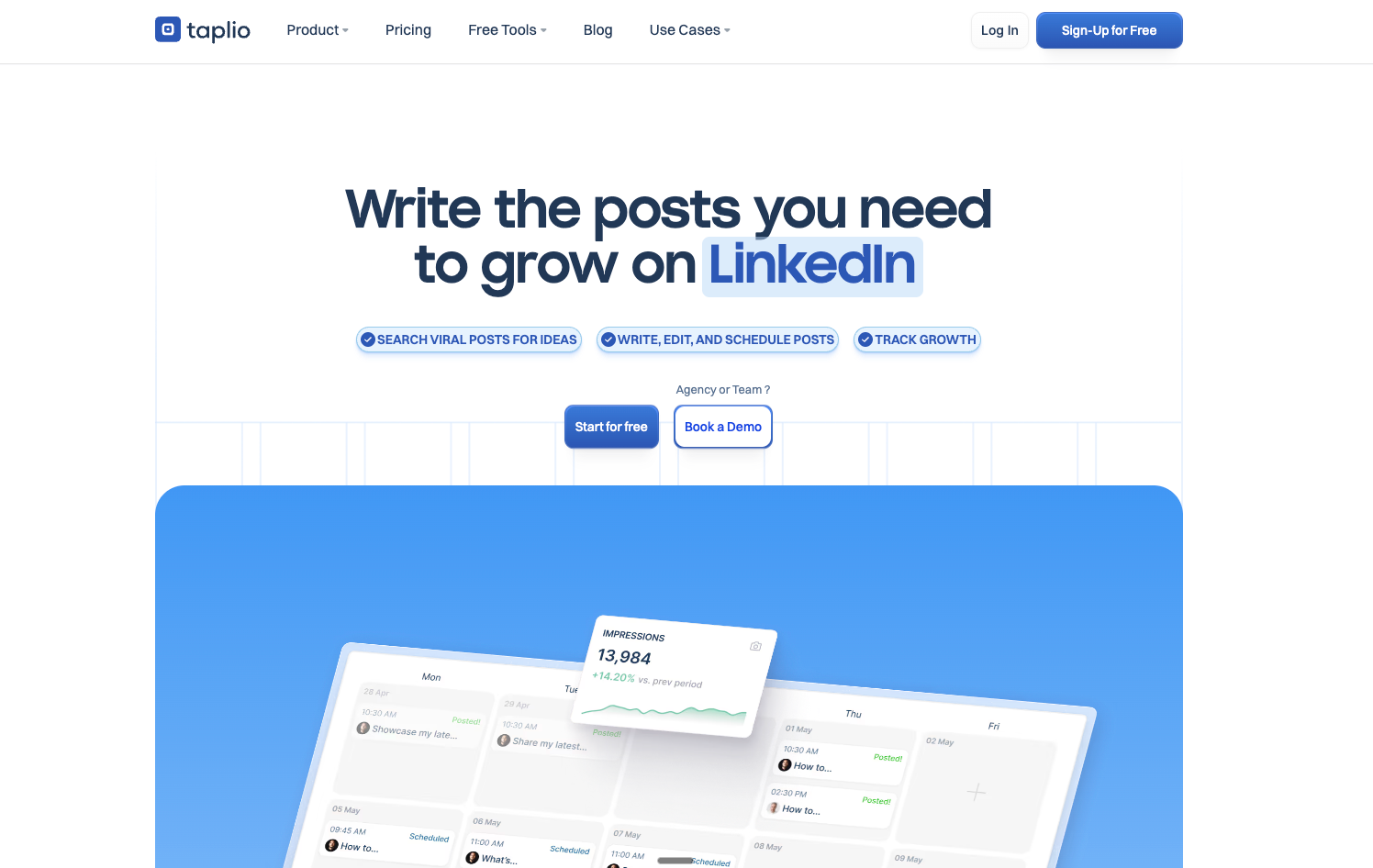 Taplio is one of the most well-known LinkedIn growth tools, and for good reason. It combines AI content creation, scheduling, a relationship builder, and a massive lead database into one platform.