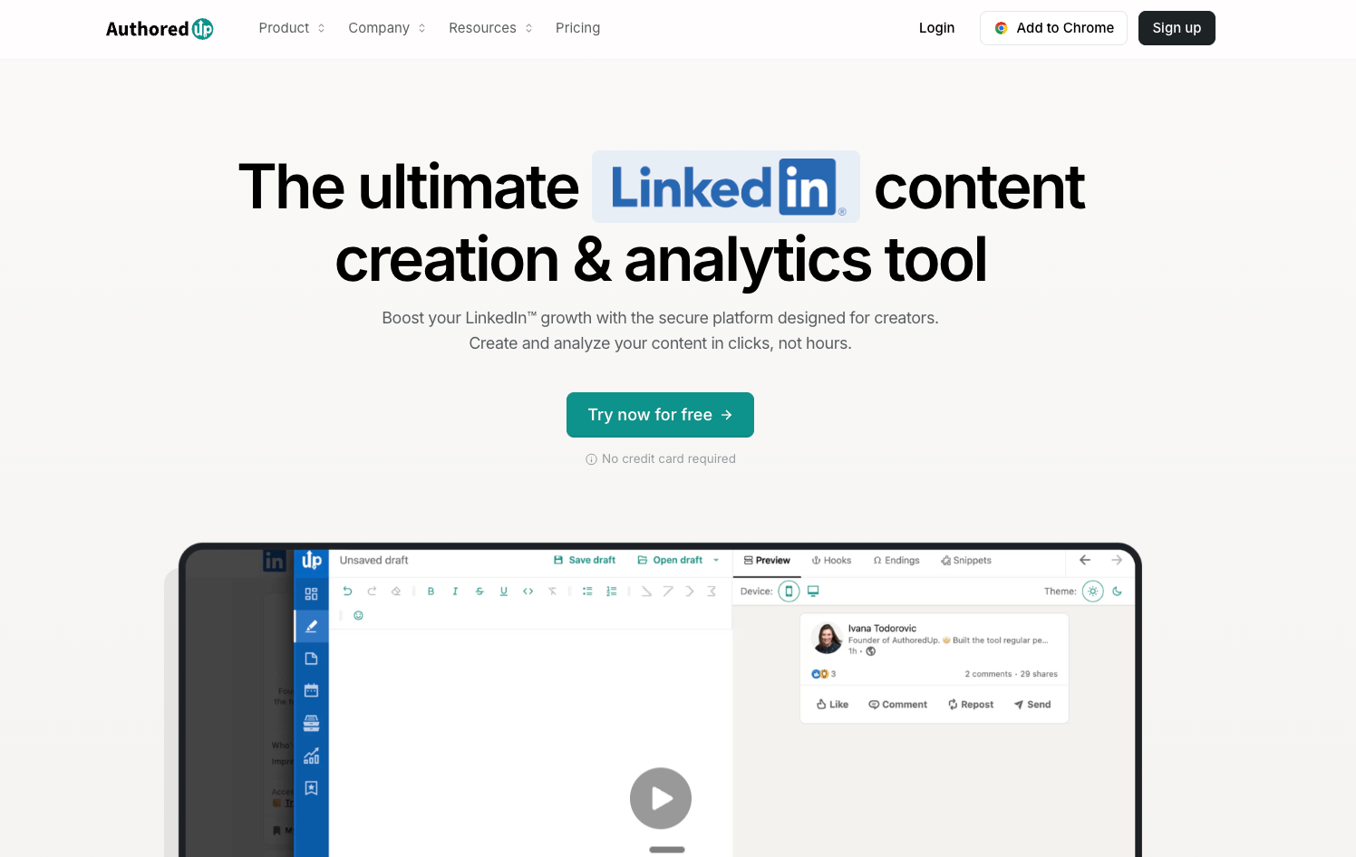 AuthoredUp takes a fundamentally different approach from Supergrow. It's a Chrome extension that enhances LinkedIn's native editor rather than replacing it. There's no AI writing — instead, you get rich formatting tools, templates, and analytics layered on top of LinkedIn itself.