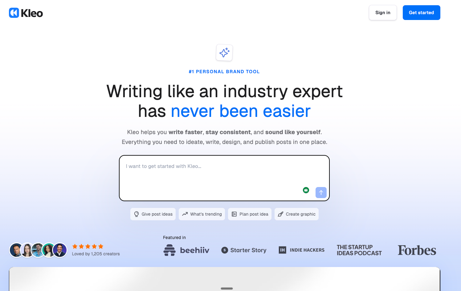 Kleo covers the full content workflow: idea capture, content planning, drafting, rewriting, graphic generation (20 images/month), and scheduling. Your writing style and identity are stored with memory, so the AI improves over time.