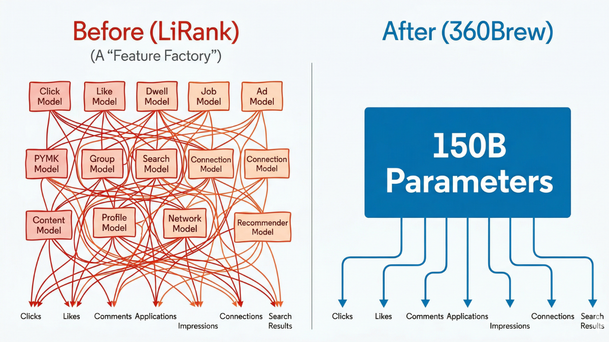 | What happened | LinkedIn replaced its entire algorithm with one AI model called 360Brew |