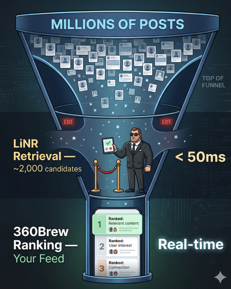 LiNR is a GPU-powered retrieval engine. Its job inside the LinkedIn algorithm: