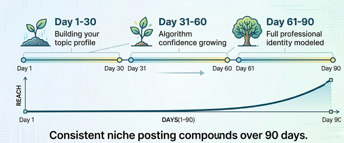 Multiple analyses, including AuthoredUp and the Trust Insights guide, suggest it takes about 90 days of consistent posting for the LinkedIn algorithm to fully model your professional identity.